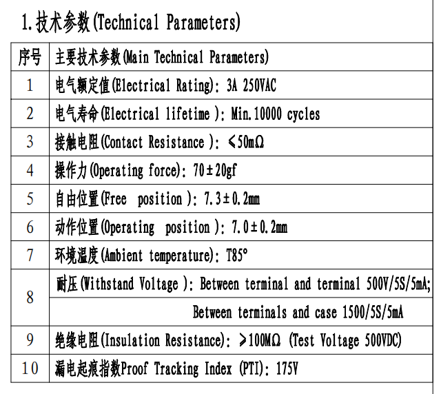 Parameter mikro stikala (specifikacija)